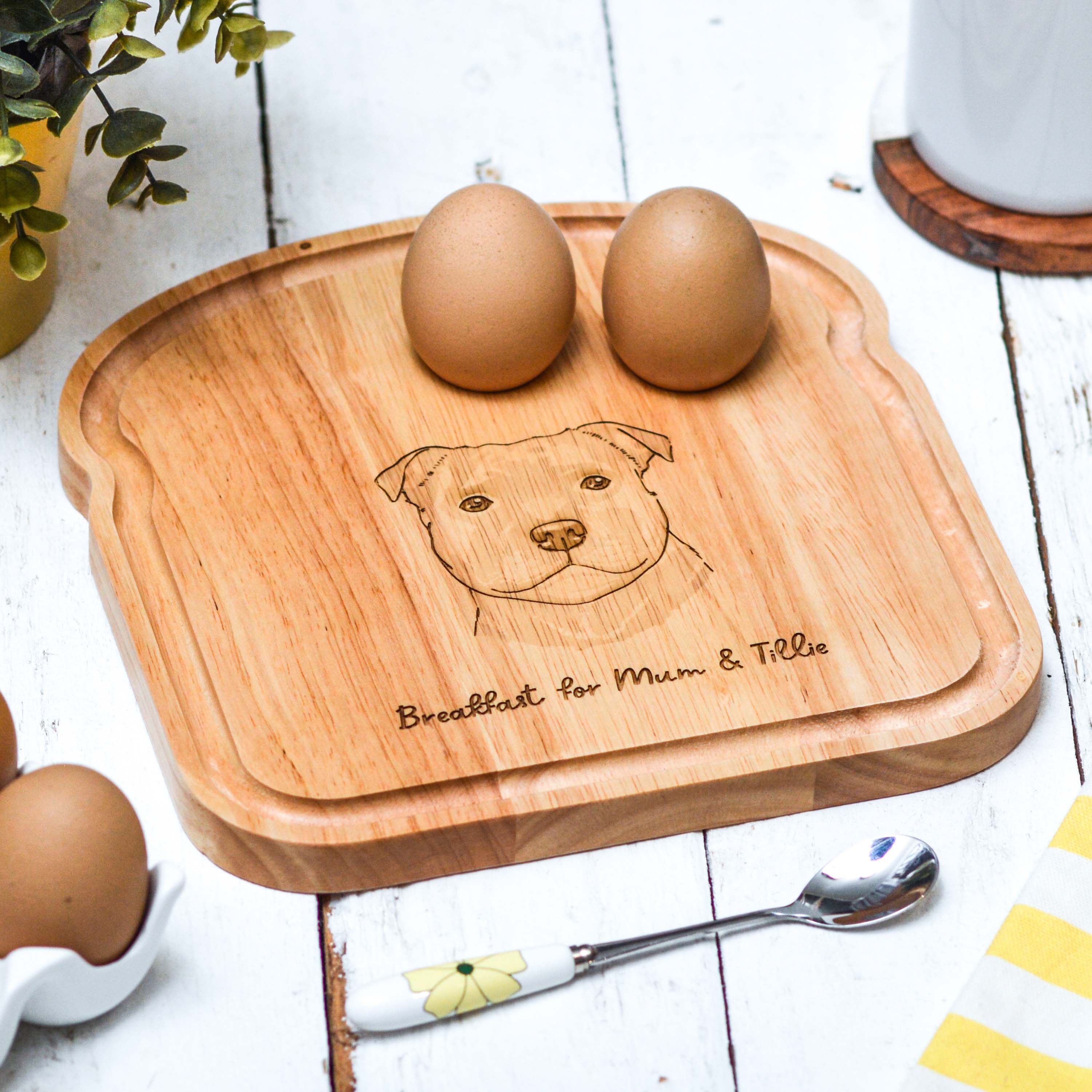 Start the day right with this personalised toast-shaped breakfast board, complete with two egg holders.
