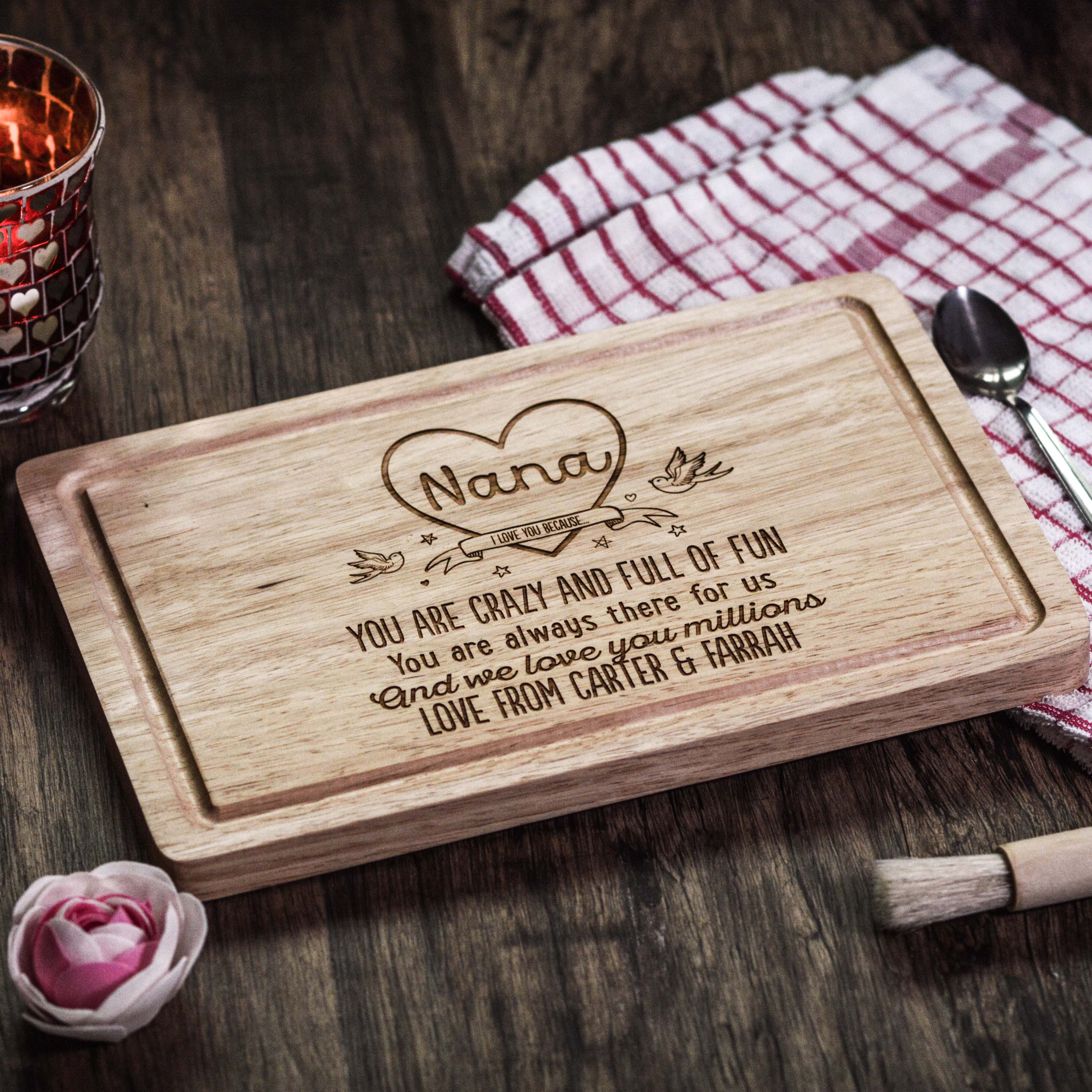 The engraved design is carefully etched for a lasting finish that won’t fade or peel, creating a piece that can be used daily or displayed with pride. Ideal for kitchens, dining spaces, or as a thoughtful gift, it combines function with a personal touch.